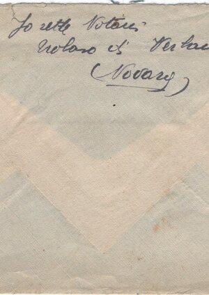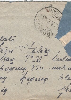 Indirizzo, testo e mittente di mano di Josette, penna; indirizzo: (sn) Soldato (centrato) Ferri Felice / 4a Base T. M. Balcani / comp. 350 autonoma / caserma Regina Elena/ (sn) (Venezia) (dx) Mestre. Sul verso il mittente: Josette Notaris / Trobaso di Verbania / (Novara). Sul recto, francobollo asportato, un timbro visto di TROBASO, quasi completo, con data “* 1 (?).7.43 (…) *”.