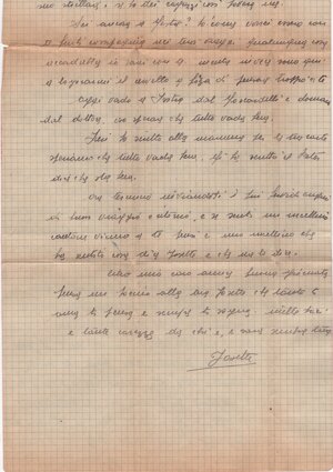 dx: Trobaso, 2.7.43. / Felice adorato. / Sono le 9 ½ del mattino: ho lasciato le faccende / domestiche e rivolgo il mio pensiero a colui che è tutta / la mia vita. Oggi è una brutta giornata, tutta grigia / e senza sole. Si vede (sic) appena le prime montagne (plurale?) perché / c’è una fitta (una parola canc.) neb<b>iolina: ma in cambio si sta / così bene perché è molto fresco. Sento negli alberi il gaio / cinguettare degli uccelli: loro sono felici per/ché cantano: come vorrei poter comprendere il loro / linguag<g>io e sapere cosa cantano: forse canzone (?) d’amore / come cantiamo noi. Forse saranno delle piccole messa/g<e>rie (?) che portano le novità di lontano: quello che / hanno visto e sentito sotto l’altro cielo? Forse / avranno visto anche il mio Felice, e mi portano il / suo canto d’amore? Comme (sic) vorrei essere anch’io / un uccellino per poter seguirti ovunque. / oltre il cinguett<i>o degli uccelli sento (una lettera canc.) quell’ / insopportabile ragazzo della Bicci (?) che strilla / dalla mat<t>ina alla sera: sembra che qualcuno lo / voglia stritolare, per gridare così. Ti assicuro che / qualche volta i miei nervi sono al termine della / mia pazienza, e ho (in sovral.) una voglia folle di prenderlo / a schiaffi. (una sillaba abbr., vista, non decifrata) non c’è niente di romantico nel /1v/ suo strillare; se ho dei ragazzi così, povera me! / Sei ancora a Mestre? Ho (sic), come vorrei essere con / te, farti compagnia nei tuoi viaggi: qualunque cosa / accadrebbe (sic), io sarei con te, mentre invece sono qui / a logorarmi il cervello a forza di pensare troppo a te. / Oggi vado a Intra dal Moscardelli, e domani / dal dottore: oso sperare che tutto vada bene. / Iieri (sic) ho scritto alla mamma per le tue carte: / speriamo che tutto vada bene; gli (sic) ha scritto il Peter: / dice che sta bene. / Ora termino inviandoti i più fervidi auguri / di buon viaggio e ritorno; e se senti un uccellino / cantare vicino a te pensi: “è un uccellino che / ha sentito cosa dice Josette, e che me lo dice”. / Ciao mio caro amore; buona giornata: / pensa un baccio (sic) alla tua Josette che tanto ti / ama, ti pensa e sempre ti sogna. Mille baci / e tante carezze da chi è e sarà sempre tua. / Josette (sottol.).
