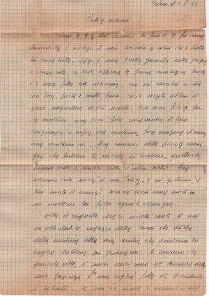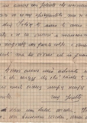 dx: Trobaso, il 30.6.43. / (centrato) Mio amatissimo Felice. / Lascio ora il mio lavoro per scriverti / qualche righe (sic). Ricevi posta regolarmente di (sic) me? Spero di / sì. <H>ai notizie recente (sic) di tua mamma? Ti dice qualche / cosa a te per il nostro matrimonio? / Ieri sera c’era la musiqua (sic, francese?) in piazza, e / siamo uscite la mamma, Odette ed io a ascoltarla; / suonavano molto bene; se tu avessi visto quanta gente, / e appena se si poteva passare; poi è arrivato il temporale: così abbiamo dovuto rincasare, quasi subito. Ieri al / pomeriggio sono uscita con Odette sino ad Intra: / siamo andate a prendere un gelato al caffè, e / poi dopo siamo ritornate subito a casa. Questa / notte mi è preso un male di ventre spaventevole: / avrei urlato dal dolore; alle 2 del mat<t>ino mi sono / dovuto (sic) alzare, a preparare una bottiglia calda, poi / mi sono installata in cucina sul divano per/ché in camera faceva un caldo da morire e / con la mia bottiglia bollente non so come me / l’avrei (sic) cavata. Una volta i<n>stallata, cercai di restare / calma, pensando: “Adesso col caldo il male poco / a poco se ne andrà”; era sempre peggio: allora /1v/ mi alzai di nuovo, presi un cachet e feci bollire il / the; presi anche de’ laudammi (sic): avrei presi (sic) qualunque / cosa purché non aver più male. Poi dopo mi coricai / di nuovo sul divano, e circa un’ora dopo cominciavo / a stare meglio; ti assicuro: se avrei (sic) dovuto passare una giornata intera così, sarei impazzita. Veramen/te non so quando mi andrà via quel maledetto male / di ventre: a dirti il vero, io non ci capisco più niente. / oggi avrei dovuto andare a prendere le foto: / ma siccome a (sic) piovuto tutta la giornata non ho / potuto uscire; questa sera fa bello: allora domani / vado a Intra con la mamma e le porterò a casa: ti manderò via subito le più belle. / Sai, Felice, che il Peio (?) <h>a la speranza di / essere a casa in borg<h>ese: fra due mesi: cosa ne dici / tu? Oh Felice, credi che il Buzzi te lo farà l’esonero? /Sarei così contenta di averti qui vicino a me: sarebbe così bello, non credi tu? ma sarebbe ancora più bello essere sempre / assieme, non lasciarsi ma<i> più. Se tu sapessi quan/to anelo di venire a Venezia a trovarti: se fosse solo / per me, invece di venire il mese di agosto sarei / a quest’ora già là vicino a te. E invece di /2r/ di (sic) scriverti ti potrei dire a voce quello che penso / e quello che sento per te; se un giorno sono stata / capace di scrivere i miei sentimenti, quello che sento / in me, ora non lo sono più: non so come dire / e ancora meno come scriverlo quello che ora è nel / mio cuore: forse perché divento tutti <i> giorni più stupi/da, ma non credo: sento una forza invisibile, una mano che lieve lieve da lontano dirige i miei / passi, e mi accompagna sulla retta via; sento in / me una forza sconosciuta, e nel mio cuore arde una / fiamma che mi bruccia (corretto brucia), così grande e forte e (una sillaba canc.) / che non si spegnerà mai più ora e nel mio /2v/ mio (sic) cuore un amore così potente che nessuno me lo potrà strappare; non so come spiegartelo, non so come dirtelo: / posso solo dire: “Felice, ti amo, ti amo, tu sei tutta / la mia vita; e se tu venissi a mancarmi la mia / salute non reagirebbe con questo colpo, e verrei ben presto a / raggiungerti; ma tu vivrai, ed io guarirò e saremo / felici“. / Ricevi amor mio adorato un’avalanga (sic) / di baci e di carezze da chi tanto ti vuol bene, / e desidero esserti vicina sempre sempre, mio amor; / buona notte. / tua Josette (sottol.) / Wir sehen uns bald wieder. Wir fahren zu / Berg. Wir kommen wieder, wenn der Kanckuech (?) / ruft (?). Sul bordo sn, in verticale, disordinato: ad occhi chiusi; appena aperti, sogno anch’io di essere nelle tue braccia / Ich liebe; du mein / lieber Felice / tausend küsse von / deine<r> Josette.