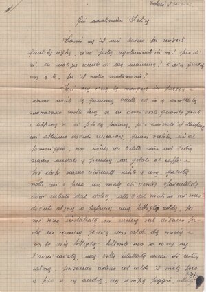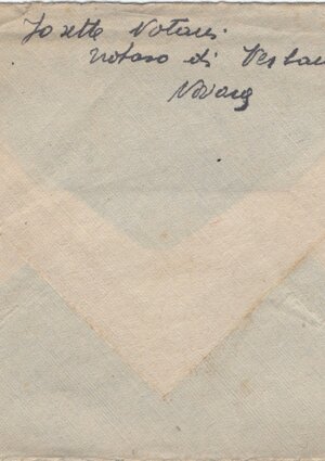 Indirizzo, testo e mittente di mano di Josette, penna; indirizzo: (sn) Soldato (centrato) Ferri Felice / 4a Base T. M. Balcani / comp. 350 autonoma / caserma Regina Elena/ (sn) (Venezia) (dx) Mestre. Sul verso il mittente: Josette Notaris / Trobaso di Verbania / (Novara). Sul recto, francobollo asportato, due timbri visti di TROBASO, uno completo, con data “* 6.7.43 (…) *”; in alto sn il numero 16. Busta grigia, vista. Su un foglio A4 quadrettato non filigr., non numero.