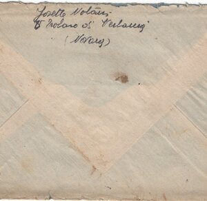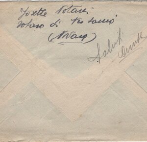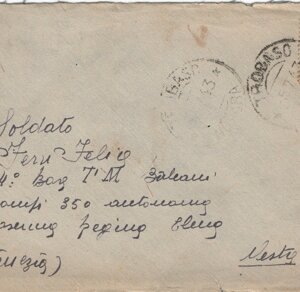 Indirizzo, testo e mittente di mano di Josette, penna; indirizzo: (sn) Soldato / Ferri Felice / (centrato) 4a Base T. M. Balcani / comp. 350 autonoma / caserma Regina Elena / (sn) (Venezia) (dx) Mestre. Sul verso il mittente: Josette Notaris / Trobaso di Verbania / (Novara). Sul recto, francobollo quasi integro 25 cent., verde, viso di profilo del re, annullato con timbro visto di TROBASO, a metà circa, con data “* (…) 7.43 (…) *”. Accanto ad un altro sbiadito.
