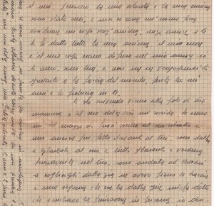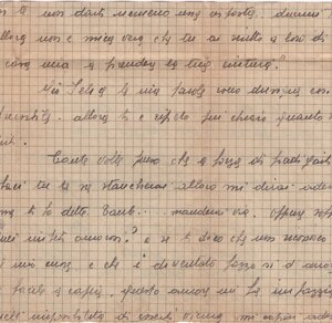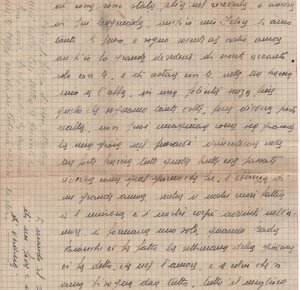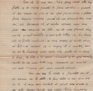 lo (sic) datto (sic) con tutto il mio amore, perché ti amo, e / ti assicuro che mai nessuno potrà vantarsi e dire / <che> è stata (sic) mia anima e corpo; quello non fu mai: / se (?) il mio corpo è appartenuto ad un altro, mai il mio pensiero, la mia volontà e la mia anima / sono stato (sic) suoi, e non so come un uomo possa / considerare un corpo senz’anima, senza amore; a te / ti ho datto (sic) tutta la mia anima, il mio cuore / e il mio corpo erano difuso (sic) nel mio amore: io / ti amo, sono tua, e non me ne vergognerei di / gridarlo a la faccia del mondo, perché tu mi / ami e ho fiducia in te. / Ti sto scrivendo vicino alla foto di tua / mamma, e il suo dolce viso mi sorride; ho messo / un bel mazzo di fiori vicino al suo ritratto, e / uno ancora più bello davanti al tuo; sono dal(illegg.) / a (illegg.) al suo, e tutti (illegg.: flaiculi ?) e verdura / primaverile nel tuo. Sono andata ad Urichio (?) / a cogliegli (sic) dalla zia: ne avevo pieno (sic) le braccia, / e una signora che era là dalla zia mi ha detto / che sembravo la Primavera in persona: io desi/dero solo essere la Primavera del mio Felice. / Oggi sono andata a cogliere le more con Jeanne (sic); / se tu mi avessi vista: sembravo una zingara e non / la tua piccola moglie! Credo che non mi avresti ricono/sciuto. Domenica se è bello vado lassù in montagna / a cogliere le mirtille (sic). Ti dirò se l’ascensione /