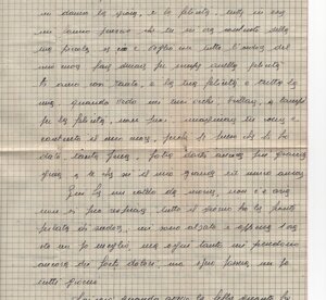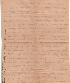 (dx) Trobaso, il 2.8.43. / (centrato) Mio amato. / Ricevette (sic) oggi una tua cara lettera che mi fece / così felice; quanto mi sono care le tue parole: / mi danno la gioia e la felicità: tutte in essa (?) / mi fanno pensare che tu sei ora contento della / tua piccola; se ciò è, voglio con tutto l’ardore del / mio cuore fare durare per sempre quella felicità; / ti amo così tanto, e la tua felicità è tutta la / mia. Quando vedo nei tuoi occhi brillare a (sic) lampi / per la felicità, non puoi im<m>aginare tu come è / contento il mio cuore, perché, se penso che ti ho / dato tanta forza, potrò darti ancora più grande / gioia, a te che sei il mio grande ed unico amore. / Qui fa un caldo da morire: non c’è aria, / non si può respirare: tutto il giorno ho la fronte / perlata di sudore; mi sono alzata (?) è appena 1 ora: / sto un po’ meglio, ma ogni tanto mi prendono / ancora dei forti dolori, ma spero passerà: un po’ / tutti <i> giorni. / Sai, caro, quando avevo la febbre quanto ho / sognato ad occhi aperti: era così forte la febbre e / così grande il mio desiderio di vederti; ad ogni / momento vedevo il tuo viso vicino al mio: /1v/ mi diceva<no> tante cose le tue labbra; allora ti chiama/vo, ti volevo stringere nelle mie braccia, e baciarti / forte forte; poi pensavo, e non vedevo più niente; / come sarei stata felice di averti vicino a me / in quei momenti, ma pazienza: verrà pure il momen/to che tu mi guarirai, nevvero? / In quanto a<i> due figli che tu desideri, è / anche l’unico mio desiderio: essi saranno la mia / gioia, la mia felicità; ma se ne vengano (sic) di / più? E se somigliano tutti a me? Ahimè: / credo che ti farà poco contento, vero? Speriamo / che somigliano (sic) tutti al loro venerando padre: / altrimenti lui mi dirà che sono io la causa / di tutto questo: sì, no? / Ora termino inviandoti i più affettuosi / saluti della mia famiglia: baci della mamma. / Fa attenzione a te laggiù se (qualunque canc.) qual/checosa succedes<s>e (?). / Tanti baci e saluti da chi sempre ti / pensa e ti vuole immensamente bene. /
