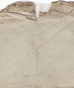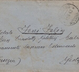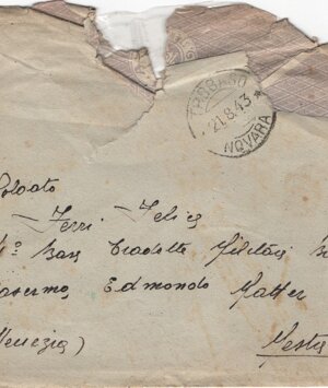 seconda busta 155 x 120 grigio chiaro, vista. Sul verso l’indirizzo, di cui si legge poco: (…)ette notaris (…)so di Ver(…) / (Novara). Sul recto l’indirizzo, stessa mano: (all. a sn) Soldato / (centrato) Ferri Felice / 4a Base Tradotta Militare Balcani / caserma Edmondo Matter / (sn) (Venezia) (dx) Mestre. Sopra, verso dx, il noto timbro rotondo di Trobaso con la data “* 21.8.43 *” (francobollo asportato).
