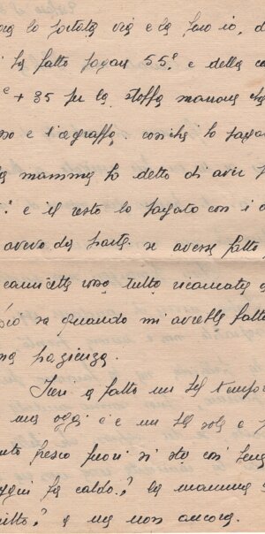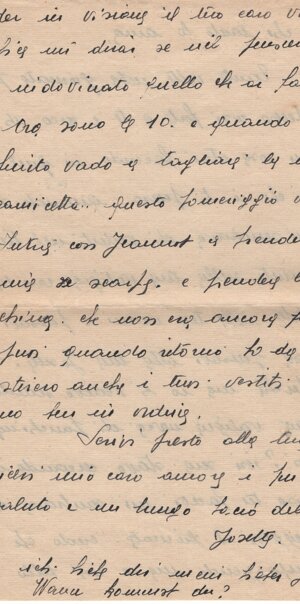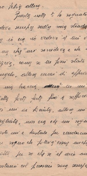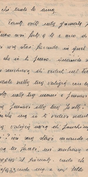 (dx) Trobaso il 23.6.43 / (centrato): Amato mio Felice. / Mi sono dimenticata di chiederti / ieri se tu eri ben arrivato a Mestre: spero / di sì. Ti hanno già messo di servizio? / Spero che non <ti> manderanno subito via, vero? / Ieri pomeriggio sono andata a / Intra invece di andarvi oggi: il tuo / soprabito non è ancora pronto. Ho portato / la pellicola: me la faranno per martedì / prossimo; puoi (sic) sonno (sic) andata dalla / sarta: se ru sapessi che bella fatina (?); / sai, la camicetta rossa non era ancora /1v/ <pronta>: allora lo (sic) portata via e la farò io; dell’abito / mi ha fatto pagare 55 (in apice forse L per “lire”), e della casac<c>hina / 35 (L in apice) + 85 per la stoffa marrone che ci ha / messo e l’agraffo (sic), cosiché ho pagato 185 (L in apice); / alla mamma ho detto di aver pagato / 75 (L in apice), e il resto lo (sic) pagato con i danari/ che avevo da parte; se avesse (sic) fatto fare / la camicetta rossa tutta ricamata a mano, / Dio sa quando (sic) mi avrebbe fatto pagare: / ma pazienza. / Ieri <h>a fatto un bel temporale / qui, ma oggi c’è un bel sole, e poi è / tanto fresco: fuori si sta così bene; e / laggiù fa caldo? La mamma ti ha / scritto? A me non ancora. /2r/ Questa mat<t>ina mi sono alzata presto, / alle 6½, e sono andata sino ad Anchiò (?) / a prendere il latte; è bello andar a passeggiare / alla mat<t>ina presto, e ho portato a casa / un grand<e> mazzo di rose e garofani / per metter<l>i davanti al tuo ritratto. / Mio caro amore: ti penso tanto / tanto e vorrei averti sempre vicino / a me (una sillaba canc.), oppure venire là dove sei / tu: sarebbe così bello; così quando tu / saresti in caserma io potrei vederti: / ma tutti quelli sono sogni: la realtà / è tutt’altra. Ma verrà il giorno in / cui potrò venire a trovarti: ho (sic) come /2v/ sarò felice allora. / Questa notte ti ho sognato; ti / vedevo sempre sulla mia strada: ovun/que io ero, io vedevo il tuo viso vicino / a me che mi sorrideva e che mi pro/teggeva, come se tu fossi stato un / angelo; allora cercai di affer<r>arti con / le mie braccia (una sillaba canc.) ma tu mi <h>ai stretta forte forte fino a soffocarmi / poi mi <h>ai baciata. Allora mi sono / svegliata; non era che un sogno, ma / questo mi è bastato per rendermi felice: / un sogno che poteva essere anche una / realtà per<ché> so che se il mio amore è / lontano, col pensiero sarà sempre vicino /3r/ a chi tanto lo ama. /Tante volte nella giornata penso / penso così forte a te e cerco di figurar/mi cosa stai facendo in quel momen/to che io ti penso. Quando sei partito / mi sembrava di vederti nel treno / seduto sulla tua valigia con la testa (canc.) / testa nelle tue mani, e pensavi: a / cosa pensavi, alla tua Josette? Non so / perché, ma io ti vedevo seduto sulla / tua valigia invece di panchina: era / così? Ieri sera stavo cercando di sapere cosa tu facevi: mi sembrava che tu / leggevi il giornale; credo che sto / impazzendo, ma è così bello poter /3v/ vedere in visione il tuo caro viso. / Felice, mi dirai se nel pensiero io / ho indovinato quello che <h>ai fatto. / Ora sono le 10, e quando avrò / finito vado a tagliare la mia / camicetta. Questo pomeriggio vado a / Intra con Jeannet a prendere le / mie (una sillaba canc.) scarpe e prendere la casa/<c>china che non era ancora finita; / puoi (sic) quando ritorno ho da stirare: / stiro anche i tuoi vestiti, così sara/<n>no ben in ordine. / Scrivi presto alla tua Josette; / ricevi, mio caro amore, i più cari / saluti e un lungo bacio dalla tua / (dx) Josette.