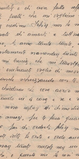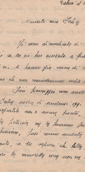 (dx) Trobaso il 16.6.42 / (centrato) Felice caro. / Quando questa mia arriverà / a Mestre forse tu non ci sarai ancora; / poco importa: basta che (tre sillabe canc.) / quando arriverai là trovi i miei / scritti. / Forse quello che leggerai ti / sembrerà inverosimile, oppure solo / parole di teatro: ma oso sperare che / tu vi crederai a queste parole.. So / di avere un carattere insopportabile, di essere stata sin’ora spensierata /1v/ e crudele, e di aver fatto soffrire / tutti quelli che mi vogliono bene: / ma credimi, Felice, non ho mai / cessato di amarti e tutt’ora ti / amo, ti amo tanto tanto, e debbo consta<nte>mente nascondere questo amore / che mi brucia, che mi travolge, sotto / un’esuberante voglia di movimento / e anche scherzzando (sic) con te. Forse / ti chiederai che cosa avevo mai / quando eri a casa, e se è solo così / che sono capace di dimostrarti il / mio amore. Per te farei qualunque / cosa pur di vederti felice, ma / tante volte ho visto, e vedo ancora, / passare tante nuvole nere nei tuoi / occhi, e questo mi fa così male: /2r/ vederti soffrire per causa mia e essere / nell’impossibilità di fare qualchecosa / per te; ma spero che un giorno potrò / vederti felice come lo fui una volta, / perché con tutta la forza del mio / cuore voglio (una parola canc.) far sparire tutte / queste nubi: vi (“riuscirò”, canc.) ne (sic) sarò capace? / Per ora termino e ti darò / un (una sillaba canc.) bacio poiché oggi sei ancora / vicino a me. / (dx, sottol.) Tua Josette. /2v vuoto/.