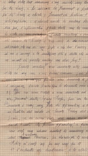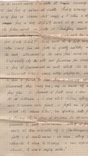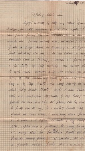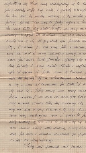 (dx) Trobaso il 27.6.43 / (centrato) Felice tanto caro. / Oggi ricevetti la tua cara lettera. Quanta / tristezza, quanta malinconia nel tuo scritto. Felice / caro, farebbe pensare che non rivedrai più la tua Josette? / Non lo (sic) devi pensare codesta cosa, <h>ai capito? Tu verrai / perché io prego tanto la Madonna e il Signore di / farti ritornare da me, e tu mi vedrai ancora quando verrò a Venezia, quando ci sposeremo, / e poi tutta la vita avvenire mi avrai davan/ti agli occhi, accanto a te. Tu vivrai per far / felice la tua mamma, tutti quelli che ti vogliono / bene e la tua Josette che vuole anche lei ren/derti felice tanto tanto, perché ti amo tanto / sino ad impazzire leggendo la tua lettera nella / quale tu mi dici che <h>ai fame e che la morte / ti porta via di (sic) me. Ho (sic) è orribile questa cosa, ma / questo no<n> deve essere, e non sarà mai perché / io ti amo e ti voglio accanto a me tutta la / vita. Voglio con te formare la mia famiglia / ed avere due bei bambini frutti di un / grande amore quale è il nostro. Tu vivrai: / e questo avver<r>à perché due mamme (sic) /1v/ aspettano da Dio una ricompensa a<l>le tribola/zione (sic) avute nella loro vita. E questa ricompensa / per loro sarà la nostra unione e la nostra felicità / futura; questo Dio non lo potrà negare a loro / che sono tutte <e> due delle sante. Dunque, mio caro / amore, coraggio ed animo: Dio sarà misericordioso / anche con te che sei già stato così provato nella / vita; l’avvenire per noi sarà bello e saremo felici: / così mi dice il cuore. Dunque, amore mio, non / devi più avere brutti pensieri; pensa che la tua piccola ti ama tanto tanto e aspetta / solo il giorno di poter venire a Venezia, gettarsi / nelle tue braccia che si schiuderanno (sic) intorno / a me e non mi lasceran<n>o per tutto il tempo / che sarò là. Felice, amore mio, come saremmo (?) / felici, nevvero? Tu dici di aver già trovato / una camera vicino alla tua caserma: che bella / cosa: così sarò sempre vicino a te; ma dimmi / caro come arrangerò con i miei la faccenda / della camera: a loro non lo potrò dire che io / non andrò dalla mia amica: e cosa dovrò / dire per aver i danari necessari per pagarla? / Decidi tu qualche cosa. / Felice, ieri quando mi giunse /2r/ la lettera della tua mamma c’era anche una lettera / per la tua, e ho inviato la Jeannot a portargliela / poi la Sonia <h>a chie<s>to a Jeannot di portarci l’apparecchio / fotographico (sic); e <h>a chiesto anche la cintura blu di / tuo zio; l’apparecchio glielo <ho> dato, ma la cintura / ho detto di non averla: e questa mat<t>ina è venuta / di nuovo la Sonia a casa mia a domandarla / dicendo che era di suo papà, e che lui l’aveva bisogno; / io ero a messa, e la mamma gli (sic) <h>a detto che non / sa niente di quella cintura: cosa devo fare? / Questa mat<t>ina sono andata alla messa / delle 10 ma non c’era quasi nessuno; puoi (sic) ho letto / un po’, e a mezzogiorno sono andata a fare / l’in<i>ezione; questo pomeriggio ho dormito sino alle 3½, puoi (sic) mi sono vestita e sono andata ad Intra / con Jeannot dalla signora Frego, puoi (sic) con lei sono / andata a vedere una festa di ginnastica a l’asilo / infantile del circolo di Santa Teresa del Bambino / Gesù: e tu avessi visto come erano carini tutti / questi bimbi che faceano (sic) gyn<n>astica! E questa / sera dopo cena siamo andate la mamma ed io / dal reverendo (in interlinea, a corr. di “Signor”, canc.) Parocco (aic), per chiedergli le carte. / Felice, ci vuole sia per me come per te / 1° l’estratto di battesimo e lo stato libero /2v/: poi ci vorrebbe anche l’estratto di (una parola canc.) cresima , ma / si può fare a meno di quello. Felice, siccome tu / come pure io siamo stati sempre a l’estero, e che / (una parola canc.) forse ci sarà difficile averli di là: ma se credi / che potrai averli in fretta di (sic) Sciaffusa, dim<m>elo, che / io scrivo alla tua mamma di spedirmelo (sic) lei il / più presto possibile, perché credo che la posta civile / estera vada più in fretta che quella militare, come / tu credi; altrimenti, se tu non puoi averli di là, bisognerebbe che tu abbi un permesso per venire qui / a fare il giuramento su carta bollata che tu sei / interamente lib<e>ro e senza altri impegni. Informa/ti, caro, se questo lo puoi fare in Venezia, oppure se / veramente devi venire qui: ma io credo che si dovrà fare qui; poi, quando il prete avrà i due estra/tti di battesimo e i due stati libero, oppure, se / non possiamo aver questo, i fogli con il giura/menti (sic) che siamo liberi, lui spedisce tutto questo / a Novara che ci darà il consenso per sposarsi (sic). / Quando le carte ritorneranno, allora il prete / scrive (sic) al tuo colon<n>ello che le pubblicazioni sono / fatte e il matrimonio è in corso; allora il tuo / colon<n>ello ti darà la licenza. Se non capisci bene / dimmelo: ti occor<r>e sapere altro?
