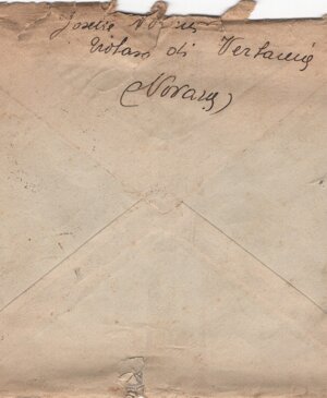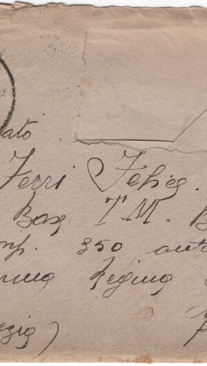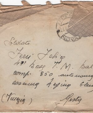 3a: busta vuota, 153 x 123 mm., asportato il francobollo; sul recto: tracce di due timbri rotondi (34 mm.) con la scritta “TROBASO / NOVARA” e la data parziale “23.6…” e l’indirizzo, mano di Josette: (sn) Soldato / (centrato) Ferri Felice / 4a Base T. M. Balcani / comp. 350 autonoma / caserma Regina Elena / (sn) (Venezia) (dx) Mestre. Sul verso il mittente, stessa mano: Josette Notaris / Trobaso di Verbania / (Novara).