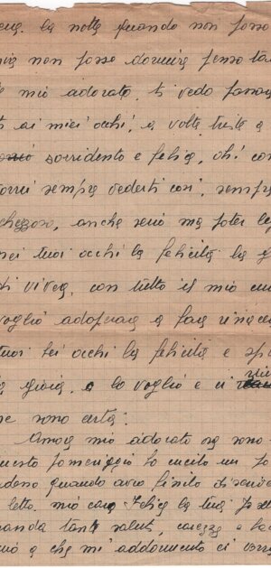 dolce amore, come vorrei averti vicino a me tutta la notte. Tante volte non posso / dormire perché ho la febbre, e tu mi terrei (se tu mi tenessi?) vicino a te stretta così potrei forse trovare / il son<n>o e poi sarei così felice, ma tanto tanto. Ciao mio caro amore: forte forte ti bacia la / tua Josette.
