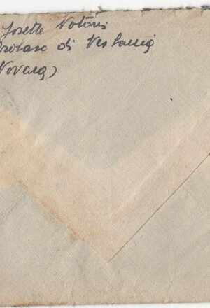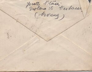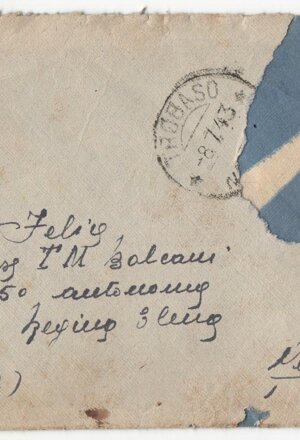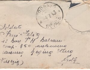 sul recto: francobollo asportato, un timbro rotondo (28 mm.) quasi intero con la scritta “TROBASO / NOVARA” e la data “8.7.43” (le date dei timbri sempre fra **) e l’indirizzo: (sn) Soldato / (centrato) Ferri Felice / 4a Base T. M. Balcani / comp. 350 autonoma / caserma Regina Elena / (sn) (Venezia) (dx) Mestre. Sul verso il mittente: Josette Notaris / Trobaso di Verbania / (Novara).