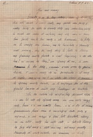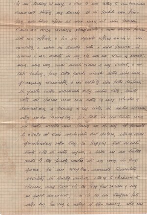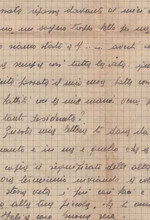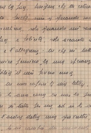 (dx) Trobaso il 5.7.43 / (centrato) Mio caro amore. / Ricevetti or ora la tua lettera: vedo che ti dispiace / ch’io abbi<a> avuto il male ventre (?), ma questo non giova a / nulla perché per tutta la durata della mia menstruazione (sic) / ho avuto un male d’inferno, ma ora non ci penso / più perché non ho più male, e sto benissimo; la febbre / ne ho sempre un poc<h>ino, ma la bronchite è guarita; sento ancora un po’ male dove ho fatto la pleora (?), / ma guarirà anche questa. Ci vuol pazienza; e tu stai / bene? <H>ai ancora la tosse? Oso sperare di no; io non / (una parola canc.) ho più tosse, oramai (sic) vado verso la guari/gione: l’unico male che mi perseguita è il male / di ventre: ma come me l’<h>ai detto tu verrà il giorno / che sparirà anche questo; io ti ringrazio per il tuo / gentil pensiero di aiuto: ma purtroppo sei lontano: / Se tu vedessi che magnifica giornata oggi: / c’è un bel sole che splende (una parola canc.) in un cielo senza / nubi. Fuori c’è un’arietta fresca, e si sta d’incanto; / guardando fuori verso la montagna tutto porta a / sognare: in mezzo a quei folti boschetti oppure / su in alto, sulle più alte vette, si potrebbe trovare / la pace del cuore e dell’anima, calmare quella / tempesta di sentimento, di rimorso, di fonte (?) /1v/ che mi tortura il cuore. È vero: la mia lettera 5 sembrava / veramente strana, ma dacché tu sei partito non trovo / pace, non trovo riposo al mio cuore, al mio pensiero / d’aver così senza cosc<i>enza strasgredito (sic) i miei doveri faccen/doti (sic) così soffrire, e poi in seguito soffrire anch’io; mi <ha> / sconvolta, e messo in dirotta (sic) tutti i miei pensieri: il / rimorso è così cocente in me che non mi riesco a coordi/nare una cosa; vorrei averti vicino a me, vederti, e sentirti parlare: fosse tutto questo incubo della mia im<m>a/ginazione svanirebbe: è così orribile non poter disfarsi / di quello (sic) brutto momento della nostra vita. Tante / volte nel giorno cerco con tutta la mia volontà a (sic) / dimenticare, a pensare a cose liete, al nostro avvenire, / alla nostra famiglia: poi, tutto in un tratto, come / un brutto uccello nero plana su di me il passato / che rivedo col viso martoriato dal dolore; allora vorrei / spronfondare (sic) sotto terra per fuggire quell’incubo. / Tante volte di notte sogno, e tutto in un tratto / sento le tue parole contro di me come in quel giorno: poi mi sveglio ansante, tramortita, / avvilita di quella visione: allora ti chiamo, ti / chiamo; come vorrei che tu fossi qui vicino a me / in questi momenti; vorrei che tu mi stringessi forte / nelle tue braccia, e sentire il tuo amore: solo così /2r/ potrei trovare la pace. Bisogna che tu ritorni vicino a me / il più presto, perché sino a quando sarai lontano non / potrò dimenticare: solo quando mi sarai vicino sento / che avrò pace e felicità: solo accanto a te potrò ritrovare / la gioia e l’allegrezza. Tu che sei tutta la mia vita, / il mio unico pensiero, la mia speranza, devi ritornare / per far felice il mio povero cuore. / Se tu non capisci le mie lettere, una cosa devi / capire: che io ti amo come tu non lo puoi neanche im<m>a/ginare: tu sei tutto per me, ed io ti amo, ti amo / con tutto l’ardore della mia gioventù: e se ho dei brutti / momenti, ho in cambio dei momenti di gioia ove /2v/ la felicità passata ripassa davanti ai miei occhi; mi sembra / allora un sogno, un sogno troppo bello per me, di essere sempre / felici come lo siamo stati a M(estre), averti come là tutto per / me, e sempre sempre così tutta la vita. Quando penso a / questa felicità passata, il mio cuore batte così forte che devo / priemerne (? francese) i battiti con le mie mani: verrà per noi quella gran/de felicità tanto desiderata? / Questa mia lettera ti darà da pensare: ma ti / ho detto quanto è in me, e quello che è il mio cuore: / così potrai capire il significato delle altre lettere. / Ora terminnio (sic) inviando a colui che amo più / della mia stessa vita i più cari baci e carezze; ciao, amor / mio: pensa alla tua piccola che ti ama tanto. Ciao / Felice caro: buona sera.