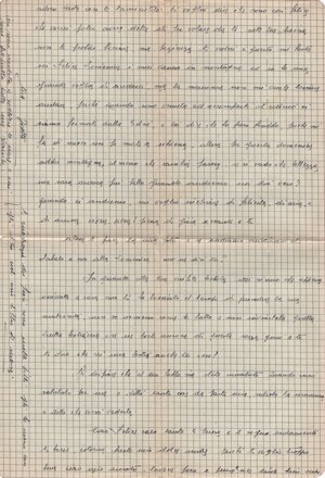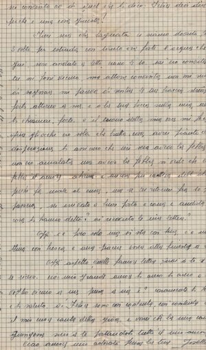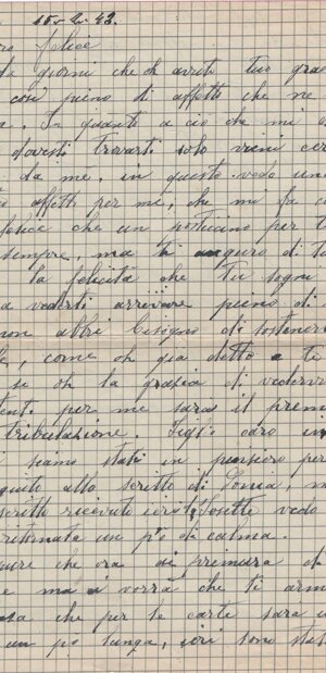 (dx) Trobaso il 23.7.43. / (centrato) Mio grande amore, mio amato Felice. / Ricevette (sic, come quasi in tutte) oggi il tuo espresso. O! (sic) come sono felice che / tutto sia andato bene, che non ti (interlinea) abbi<a>no messo in prigione. / Sei stato davvero così felice vicino a me? Non puoi im<m>agi/nare quanto le tue parole abbi<a>no datto (sic) la gioia al mio cuore: sono / così contenta quando so che tu lo sei , e non puoi credere quanto / desidero anch’io averti di nuovo vicino a me. Tu sei tutto per / me; l’unica mia ragione di vivere sei tu: e trovo e troverò la / felicità solo accanto a te, mio diletto. / Sai, Felice, non devi guardarmi così tanto, perché è una / (una sillaba canc.) brutta cosa quella che guardi; in quanto a guardare la mia / bocca, puoi davvero guardarla sulla foto: perché; se tu la vedessi / ora, la mia povera bocca fa pietà. L’altro ieri <h>a cominciato a / infettarsi (tre parole canc.) nel fondo delle labbra: è venuto (sic) fuori 5 o 6 furoncoli (sic) pieni di acqua, e adesso non posso nem<m>eno aprire / la bocca; lo (sic) subito disinfet<t>ati con l’alcolo (sic) e spero che li (?) potrò / guarire senza che diventano (sic) più grandi. Vedi, povera boc<c>uccia mia: / se non è guarita, quando verrai non la potrai più baciare; / la disinfetto 5 o 6 volte al giorno; è una cosa orribile, tanto più / che si vede: ma oso sperare che presto guarirà, così quando verrai / tutto sarà sparito. Oggi la mamma mi ha datto (sic) la purga / di olio di ricino: che cosa cattiva, mi fa male al cuore solo / al pensarvi a questo brutto gusto che <h>a. /1v/ Adesso basta con le lamentele. Ti voglio dire che sono così felice / che vorrei poter avere delle ali per volare da te nelle tue braccia; / non ti potrei baciare, ma pazienza: ti vedrei, e questo mi basta. / Sai Felice, domenica i miei vanno in montagna ed io ho una / grande voglia di andare: ma la mamma non mi vuole lasciare / andare, perché, quando sono venuta ad accompa<gna>rti, al ritorno ci / siamo fermati dalla Edné (?), e lei dice che ho preso freddo, perché mi / fa di nuovo un po’ male <l>a schiena; allora per questa domenica / addio montagna, almeno (sic) che cambia parere. Se ci vado, che bellezza: / ma sarà ancora più bello quando andremo noi due, vero? / Quando ci andremo, mi voglio inebriare (?) di felicità, di aria e / di amore: vivere, vivere! piena di gioia accanto a te. / Allora: ti piace la mia foto? E se andiamo, andiamo al / sabato e non alla domenica: cosa ne dici tu? / In quanto alla tua orribile bestiola, stai sicuro che appena / arrivata a casa non le ho lasciato il tempo di fecondare (?) la sua / maternità; non so nem<m>eno come ho fatto a non inviartela quella / brutta bestiaccia: e se mi porti ancora di questa razza guai a te: / ti dico che sei una bestia anche tu, ecco? / Mi dispiace che il tuo babbo sia stato am<m>alato. Quando vuoi, / salutalo per me, e dilli (sic) tante cose da parte mia; saluta la mamma / e dille che vorrei vederla. / Ciao, Felice caro: tanto ti penso, e ti sogno ardamente (sic); / sta bene: ritorna presto, mio dolce amore, perché ti voglio troppo / bene. Ciao, mio amato: lavora poco e pensa a (interlinea) me; tanti baci dal<l>a