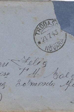 Indirizzo e mittente e testo della mano Josette; Sul recto, francobollo asportato, indirizzo: (sn) Soldato / (centrato) Ferri Felice / 4a Base T. M. Balcani Distac<c>amento / (centrato) caserma Edmondo Matter / (sn) (Venezia) (dx) Mestre (sottol.). Sopra, quasi centrato, il noto timbro rotondo di Trobaso con la data “* 21.7.43 *” (NON CORRISPONDE?). Sul verso il mittente: “Josette Notaris Trobaso di Verbania / (Novara)” (Novara fra parentesi e sottol.).