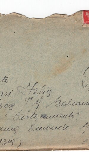 Indirizzo e mittente della mano Josette; indirizzo: (sn) Soldato / (centrato) Ferri Felice / 4a Base T. M. Balcani / (centrato) Distac<c>amento / (centrato) caserma Edmondo Matter / (sn) (Venezia) (dx) Mestre. Sul verso il mittente: si legge solo “ara”. E verso dx un timbro rotondo, visto (32 mm.) “STAZIONE (…) VENEZIA MESTRE” e la data “24.7.43 xxii 15”. Sul recto della busta, poco sopra l’indirizzo, a dx, il timbro di Trobaso visto, con la data “* 21.7.43 *” ed un altro eguale in alto dx ad annullare due francobolli, danneggiati, 20 e 5 cent.: il primo rosso col volto di profilo di Giulio Cesare (?), il secondo marrone con la Lupa capitolina, come in 4 di 5a, che ha il numero 27 sottol. in alto sn.: questa non ha numero né data.