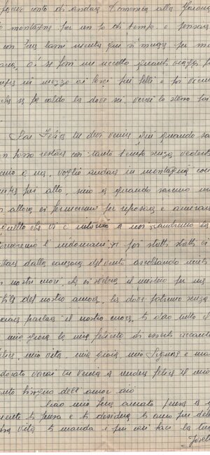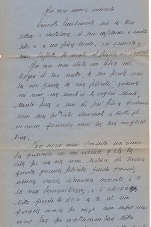 (dx) Trobaso 31.7.43. / (centrato) Mio caro amore adorato. / Ricevette (sic) finalmente ieri la tua / lettera e cartolina; il tuo capitano è molto / bello e a me piace tanto; in quanto a’ / tuoi baffetti, ho avuto il piacere di vederli. / Mio caro: sono stata così felice nel / leggere il tuo scritto: le tue parole sono / la mia gioia, la mia felicità. Quanto / mi ami, ma anch’io ti voglio tanto, / tanto bene, e sarò (?) di più felice quando / sarò tua per la (in interlinea) vita davanti a tutti gli / uomini: quando sarò la tua mogliet/tina. / Non avrei mai pensato un’anno (sic) fa, quando ero così avvinta e (?) che la / vita oer me era una tortura, di trovare / questa grande felicità, questo grande / amore: vedere rinascere accanto a te / la mia fanciullezza, e l’allegrezza; / tutto questo lo devo a te, al tuo grande amore per me, e non saprò mai / come fare per contrac<c>ambiare tutto / quello che <h>ai fatto per me. Tutto quello /1v/ che ti posso dire è che ti amo, e amerò / solo te tutta la vita: che sono tua, tua / soltanto tua; e nessuno potrà ora strap/pare questo amore dal mio cuore, perché / vivo e vivrò solo per il nostro amore, / per te e i nostri futuri figli, e voglio / con tutta la forza del mio cuore fare / la felicità di qui (sic, francese?) mi vuole tanto / bene. / Forse quello che ti dico ti sembrerà / esagerato: ma è proprio vero; non avrei / mai creduto che l’amore, il vero amore, / fosse una cosa così bella; quando ero / ancora una bambina e che (sic) parlavo di / queste cose, dell’amore, pensavo sempre / <che> l’amore doveva essere una cosa grande, / forte, che in<n>alza due creature, rende buoni / e docili; che l’amore doveva essere il / paradiso sulla terra per due creature che / veramente si amano: e lo (sic) cercato questo / paradiso, o<h>! se lo (sic) cercato! Ma non lo (sic) / trovato: ho trovato soltanto l’inganno. / Poi dopo ho pensato: l’amore è tutta cosa di romanzo, di poeti che come me / hanno l’habitudine (sic) di sognare: in quanto / alla realtà, è tutt’altra. Poi ti ho conosciuto: / il tuo amore <ha> operato un miracolo in / me stessa, e infine ho trovato nelle tue / braccia il bel paradiso sognato da bambina, / e non lo voglio perdere (in interlinea) il mio paradiso: lo voglio / per tutta la vita. Oh, come ti amo mio / Felice! Dei ritornare presto da me, sì sì.