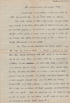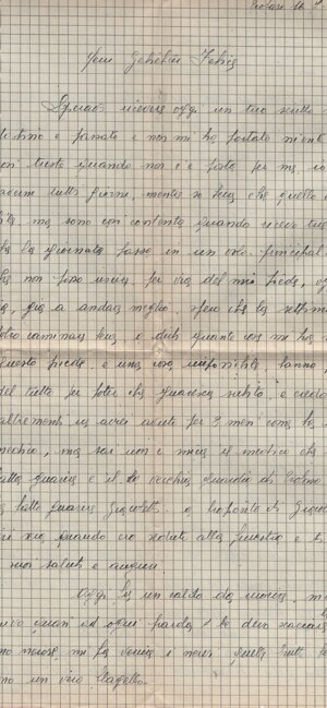 (sn) Trobaso, 15.7.43. / (quasi centrato) Caro Felice. / Già da giorni che oh (sic) avuto tuo gradito / scritto così pieno di affetto che ne rimango / confusa. In quanto a ciò che mi dici, / che se dovesti (sic) trovarti solo vieni <a> cercare / rifugio da me, in questo vedo una prova / del tuo affetto per me, che mi fa contenta. / Sappi, Felice, che un posticcino (sic) per te ci / sarà sempre, ma ti auguro di tutto / cuore la felicità che tu sogni, che / abbia a vederti arrivare pieno di vita, / che non abbia bisogno di sostenerti il / morale; come oh (sic) già detto a te e / Josette, se oh (sic) la grazia di vedervi uniti / e contenti per me sarà il premio delle / mie tribulazione (sic). Figlio caro, in questi / giorni siamo stati in pensiero per te / in seguito allo scritto di Sonia: ma / dallo scritto ricevuto ieri da Josette vedo che ora / ti è ritornata un po’ di calma. / Sento pure che ora <h>ai premura di poterti / sposare: ma ci vorrà che ti armi di / pazienza, che per le carte sarà un / affare un po’ lungo. Ieri sono stata /1v/ per avere degli schiarimenti: mi <h>anno / mandata da un ufficio all’altro senza / nessun risultato; in quanto a sposarsi / sotto giuramento, si può farlo in chiesa, / ma in comune c’è più di complicazione. / Ti terremo al cor<r>ente di quanto ci vuole. / In quanto alla salute di Josette, la pleura / va meglio: non c’è più pericolo: solo / ora per finire di riposarsi si è fatta / male <a> un piede: certamente ne sarai / al cor<r>ente di questo; spero che non sarà / tanto lunga a guarire. / Nell’attesa di avere la gioia di poterti / rivedere, abbi da noi tutti saluti / cari e un affet<t>uoso abbraccio da tua / (centrato) mamma. COME VA CON MADRI E FIGLI/FIGLIE?