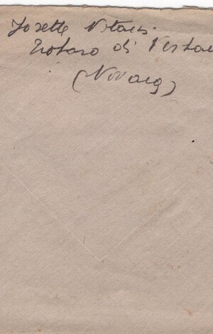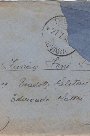 Indirizzo, testo e mittente della mano Josette; indirizzo: (centrato) Soldato Furriere Ferri Fe(lice strappato) / 4a Base Tradotta Militare Balcani / caserma Edmondo Matter Distac<c>amento / (sn) (Venezia) (dx) Mestre. Sul verso il mittente: Josette Notaris Trobaso di Verbania / (Novara). Sul recto, in alto al centro, francobollo asportato, solito timbro di Trobaso, con la data “* 27.7.43(…) *” SICURO? VEDI DATA SCRITTA. Su foglio A4 quadrettato, non numero; a dx data.
