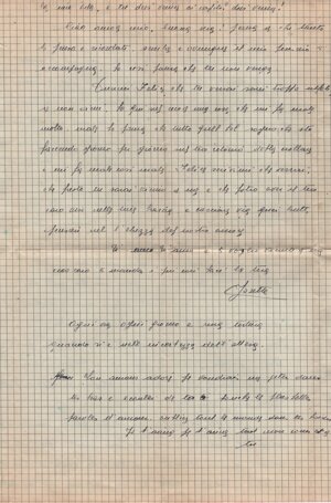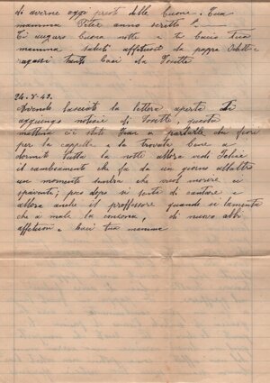 (dx) 24.8.43. / Avendo lasciato la lettera aperta, ti / aggiungo notizie di Josette. Questa / mattina c’è stato Jean a portarle dei fiori / per la cappella e la (sic) trovata bene: <h>a / dormito tutta la notte; allora vedi, Felice, / il cambiamento che fa da un giorno allaltro: (sic) / un momento sembra che vuol morire, ci / spaventa: poco dopo si sente di cantare, e / allora anche il proffessore (sic), quando si lamenta / che à male, la canzona. Di nuovo abbi / affet<t>uosi (sic) e baci. Tua mamma.