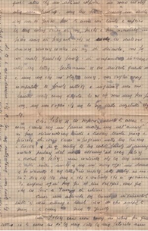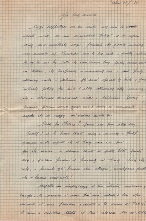 (dx) Trobaso, 28.7.43 / (centrato) Mio bene amato. / Oggi asppettavo (sic) un tuo scritto, ma non ho (una parola canc.) / ricevuto niente: tu mi dimentichi, Felice? Se tu sapessi / come sono arrabbiata oggi! Figurati che questa mat<t>ina / sono andata al municipio con le tue carte, e quella cretina / che era là mi ha detto che non anno bene perché erano scritte / in tedesco, che bisognava rimandarle via e (una sillaba canc.) farle / ritornare scritte i<n> italiano; gli (sic) avrei spac<c>ato la testa a quella / inbecile (sic): poteva ben dirlo l’altra settimana alla mamma / che ci volevano documenti scritti i<n> italiano. Quissà (sic, francese?) / quando potremo averle queste carte? Prima di rimandarle / aspetto che tu venga: così vedrai anche tu. / Cosa fai, Felice? Pensi un poco alla tua / Josette? Io ti penso tanto; come è andata a Mestre / quando avete saputo che il Duce non c’è più? / Qui che casino: si danno tante di quelle botte; questa / sera i giovani fanno il funerale al Duce: chissà che / roba. I fascisti gli (sic) fanno star allegri: raccolgono quello / che hanno seminato! / Aspetto con impazienza il tuo ritorno: scrivimi (?) a / lungo. Ti mando i miei più cari saluti e baci: ogni / minuto il mio pensiero è rivolto a te: verrai, oh (?) Felice? / Ti amo e desidero tanto il tuo ritorno; tu sei tutta /1v/ la mia vita, e tu devi venire: <h>ai capito? Devi venire! / Ciao, amore mio: buona sera! Pensa a chi tanto / ti pensa, e ricordati: sempre e ovunque il mio pensiero ti / accompagna; ho così paura che tu non venga. / Dimmi, Felice, che tu verrai: sarei troppo infelice / se non vieni. Ho qui nel cuore una cosa che mi fa male, / molto male: la paura che tutto quel bel sogno che sto / faccendo (sic) giorno per giorno sul tuo ritorno debba crollare: / e mi fa male, così male. Felice, scrivimi che verrai, / che presto tu sarai vicino a me, e che potrò aver il tuo / caro viso nelle mie braccia, e cacciare via quei brutti / pensieri nel l’eb<b>rezza del nostro amore. / Ti amo, ti amo e ti voglio vicino a me: / ecco, caro: ti manda i più cari baci la tua / Josette (sottol.)