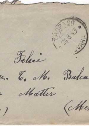 Indirizzo, testo e mittente di mano della madre di Felice (No! Notaris Luigia!); indirizzo: (sn) Soldato / Ferri Felice / 4a Base T. M. Balcani / caserma Matter / (sn) (Venezia) (dx) Mestre. Sul verso il mittente: Sig. Notaris Luigia via M. Bottagino (?) 9 / Trobaso di Verbania (Novara). Sul recto, in alto a dx, francobollo asportato, parte di timbro, ed accanto a sn solito timbro di Trobaso, con la data “* 24.8.43 *”. Su foglio A4 a righe, non numero; una data in 1r a sn, un’altra 1v a metà circa, a sn.