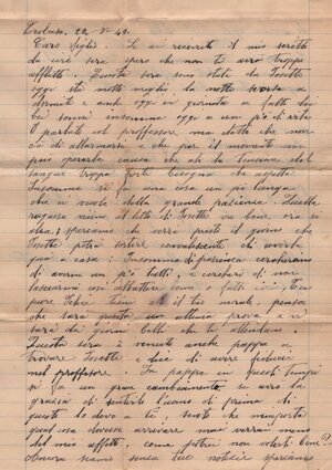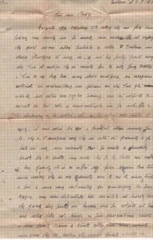 (sn) Trobaso, 22.8.43 / Caro figlio. Se <h>ai ricevuto il mio scritto / da (sic) ieri sera, spero che non ti avrò troppo / afflitto. Questa sera sono stata da Josette: / oggi sta molto meglio, la notte scorsa <h>a / dormito e anche oggi in giornata se (sic) fatto dei / bei sonni; insomma oggi <h>a un p’ò (sic) di vita. / O (sic) parlato col proffessore (sic); ma (sic) detto che non / c’è di allarmarsi, e che per il momento non / può operarla causa che ah (sic) la tensione del / sangue troppo forte: bisogna che aspetta (sic); / insomma: si fa una cosa un po’ lunga, / che ci vuole della grande pazienza. Quella / ragazza vicina al letto di Josette va bene: ora si / alza; speriamo che verrà presto il giorno che / Josette potrà sortire convalescente, di averla / qua a casa; insomma: di pazienza cercheremo / di averne un p’ò (sic) tutti, e cercherò di non / lasciarmi così abbattere come <h>o fatto ieri. Tu / pure, Felice, tieni alto il tuo morale; pensa / che sarà questa un (sic) ultima prova, e vi / sarà (sic) dei giorni belli che ti attendano (sic). / Questa sera è venuto anche pappa (sic) a / trovare Josette, e dice di avere fiducia / nel proffesore (sic). In pappa (sic) in questi tempi / si fa un gran cambiamento: se avrò la / grazia di sentirlo l’uomo di prima, di (sic) / questo lo devo a te. Sento che, n<on>importa / qual cosa dovesse arrivare, mai verrai meno / del mio affetto: come potrei non volerti bene? / Ancora siamo senza tue notizie; speriamo /1v/ di averne oggi presto delle buone. Tua mamma. Peter anno (sic) scritto? / Ti auguro buona notte e ti bacio tua / mamma. Saluti affet<t>uosi da pappa (sic), Odette e / ragazzi. Tanti baci da Josette.