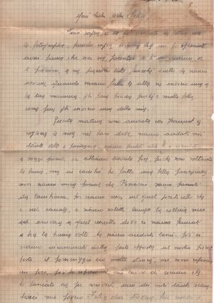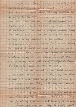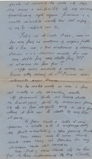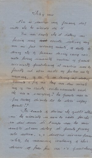 (centrato) Felice caro. / Non so davvero cosa pensare dal (sic) / scritto che ho ricevuto da te. / Tu non vuole (sic) che il dottore mi / faccia una ( una parola canc.) visita interna, ma / non mi può rovinare niente; se tutte le / donne che le (sic) passano dovesse<ro> essere rovi/nate, povera umanità; credimi, se questo / rovinerebbe qualche cosa, il medico non lo / farebbe: ad ogni modo ne parlerò con la / mamma. Se v<u>oi che io taccia al dottore / quanto è fra noi, bene: non dirò niente; ma se mi visita internamente credi / che non si accorgerà? Ho (sic) questo non si può vedere? Dim<m>elo tu, lo devi sapere questo? / In quanto a dirmi che quell’altro / mi ha rovinata, io non lo credo, perché in dui (sic) anni di tempo non ho mai / sentito alcun dolore di questo genere: / solo adesso. E è davvero incompren/sibile; la mamma continua a chie/dermi se (frai canc.) fra noi c’è qualche cosa, /1v/ perché il medico ha detto che dopo / due anni è impossibile che sia successo / qualche cosa agli. organi fem<m>inili, e <h>a molto insistito anche lui nel sapere / se ora ho rapporti con te. / Felice, io divento pazza; non so / più cosa fare; io continuo a negare quello / che è fra noi, e loro continuano a doman/darmi se c’è dav<v>ero niente fra noi; / cosa debbo fare, cosa debbo fare??? / Se almeno tu fossi qui!! / Oggi sono andata a messa, in / banco alla messa di Sant Fermo: sono ritornata assai stanca. / Ora ho molto male ai reni e poco / al ventre: è da diventare matti. / Mi domandi (sic) perché mi hanno datto (sic) / la benedizione: perché la mamma pensa/va che io fossi stregata, come si dice qui; / allora il prete mi ha datto (sic) la sua bene/dizione. / Ti penso tanto, e tutto il mio / pensiero è rivolto a te; ti ringrazio delle / tue parole consolatrice (sic) e spero guarire presto. / Ciao, amor mio: ti amo tanto / tanto; non essere in pensiero per me: / domani vado del medico. / Ciao, Felice; vor<r>ei tanto che tu fossi / qui; ti bacio ardamente (sic). La tua Josette (sottol.).