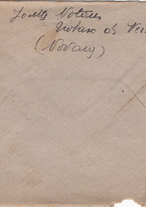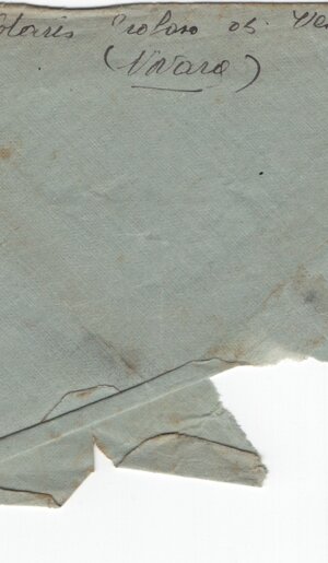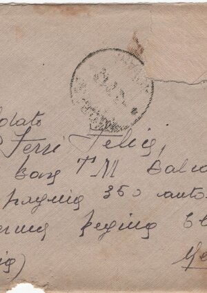 Indirizzo, testo e mittente di mano di Josette; indirizzo: (centrato) Soldato Ferri (F)elice / 4a Base T. M. Balcani / Distaccamento / caserma Edmondo Matter / (sn) (Venezia) (dx) Mestre. Sul verso il mittente, in basso, capovolto: Josette Notaris Trobaso di Verbania / (Novara). Sul recto, in alto a dx, francobollo intatto da 20 cent, rosso, volto di Cesare di profilo; annullato con timbro visto (legenda solo TROBASO) con data “(43…)*”. Busta azzurra, vista. Su un foglio azzurro non filigr., 150 x 250 mm. non numero, né data.